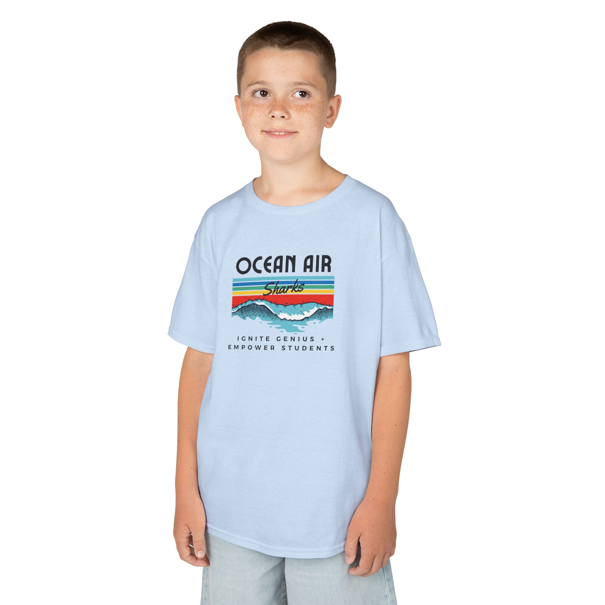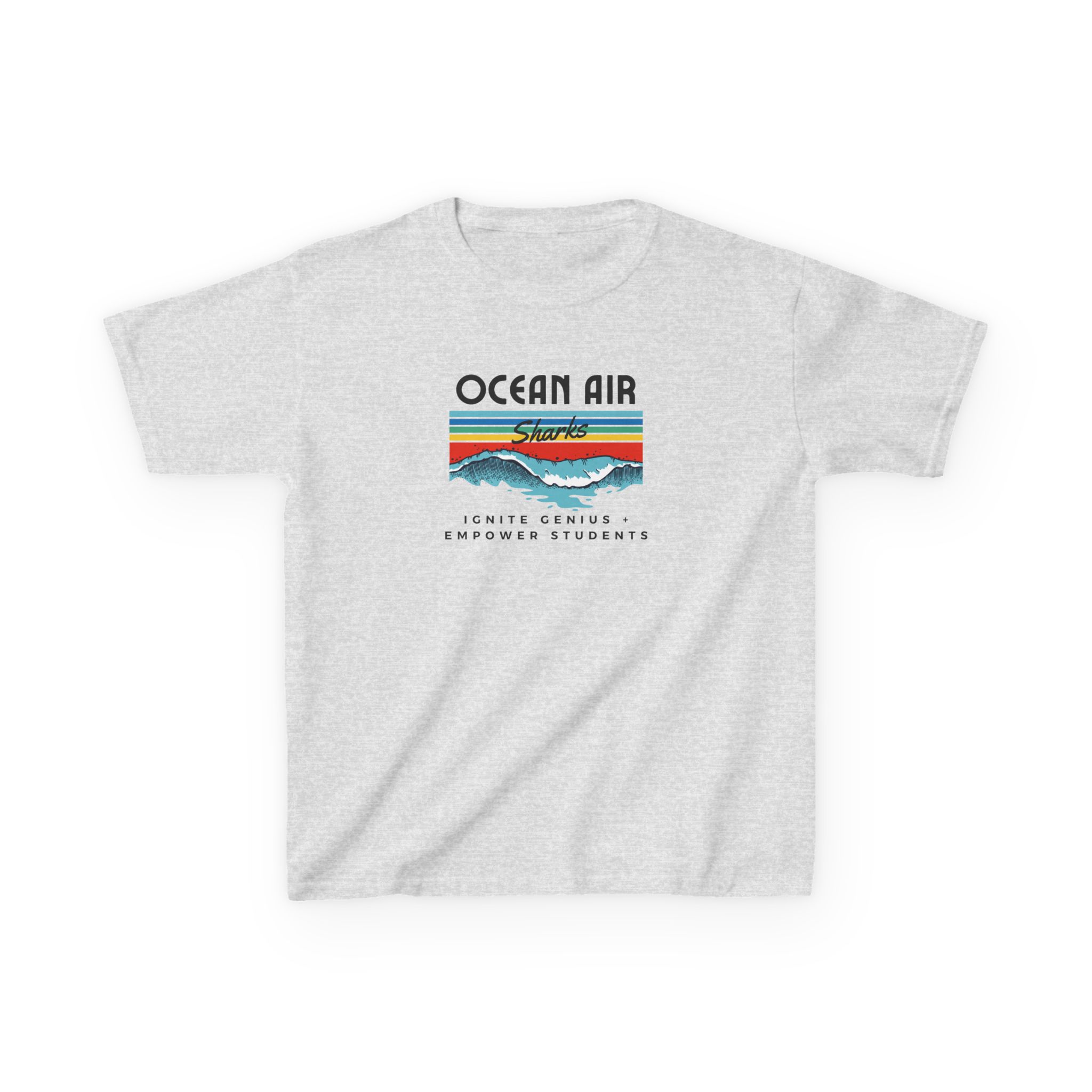 Bright, bold, and full of school spirit — the Ocean Air Rainbow Wave Kids Tee is a must-have for every young Shark! Featuring a colorful retro wave design with the Ocean Air Sharks logo and the inspiring motto “Ignite Genius • Empower Students,” this hoodie combines comfort and pride in one stylish piece.